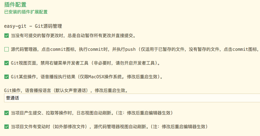 设置 HBuilderX 【插件设置】, easy-git可配置的选项如下: 配置项 默认值 说明 当没有可提交的暂存更改时,总是自动暂存所有更改并直接提交 false 开启后,执行git add & git commit Git源代码管理器视图自动刷新 true 当项目文件发生变动,自动刷新视图 Git日志视图自动刷新 true 当git log发生变动,自动刷新视图